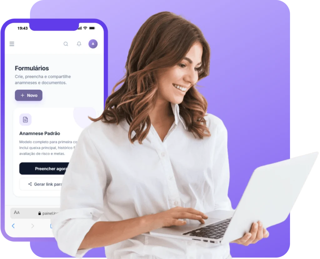 Envie um link seguro para o paciente preencher a anamnese antes da primeira sessão.